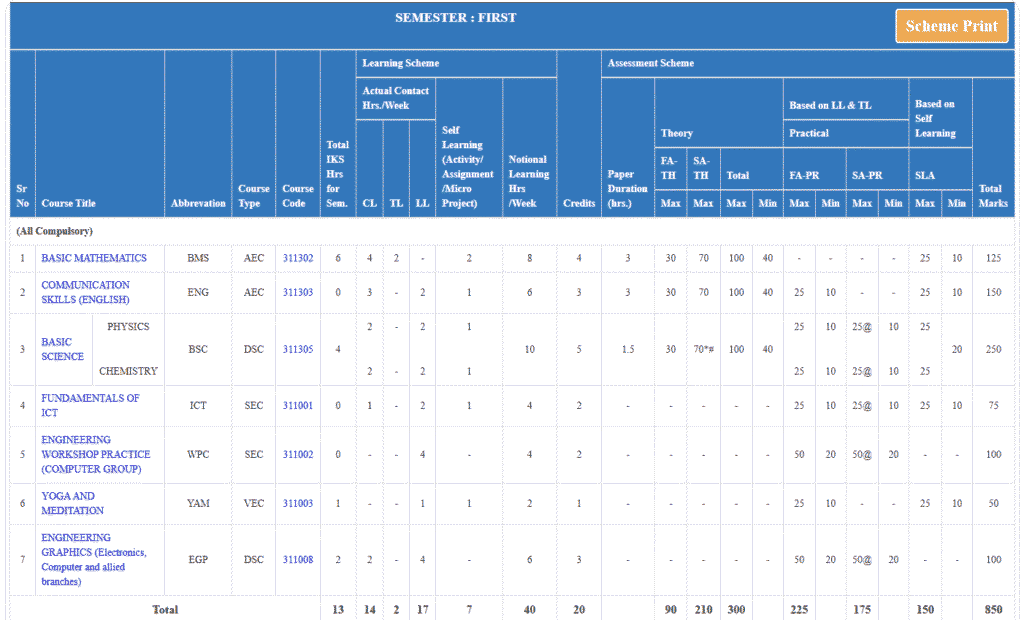 In this post I am going to provide the syllabus of 1st year 1 semester only. In upcoming post, we are providing the 2nd semester to 6th semester.